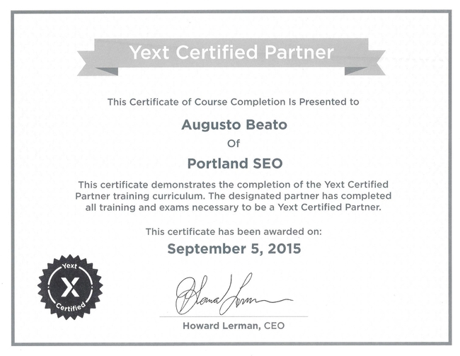 Yext, a Digital Location Management company based in New York, uses its platform to help businesses build their audiences through their network of mobile apps, directories, social media partners and search engines. “By becoming a Portland Yext Certified Partner, we are able to update and manage all of our clients’ addresses on listing profiles online,” explains Augusto Beato, spokesperson for Portland SEO.Yext Certified Partner